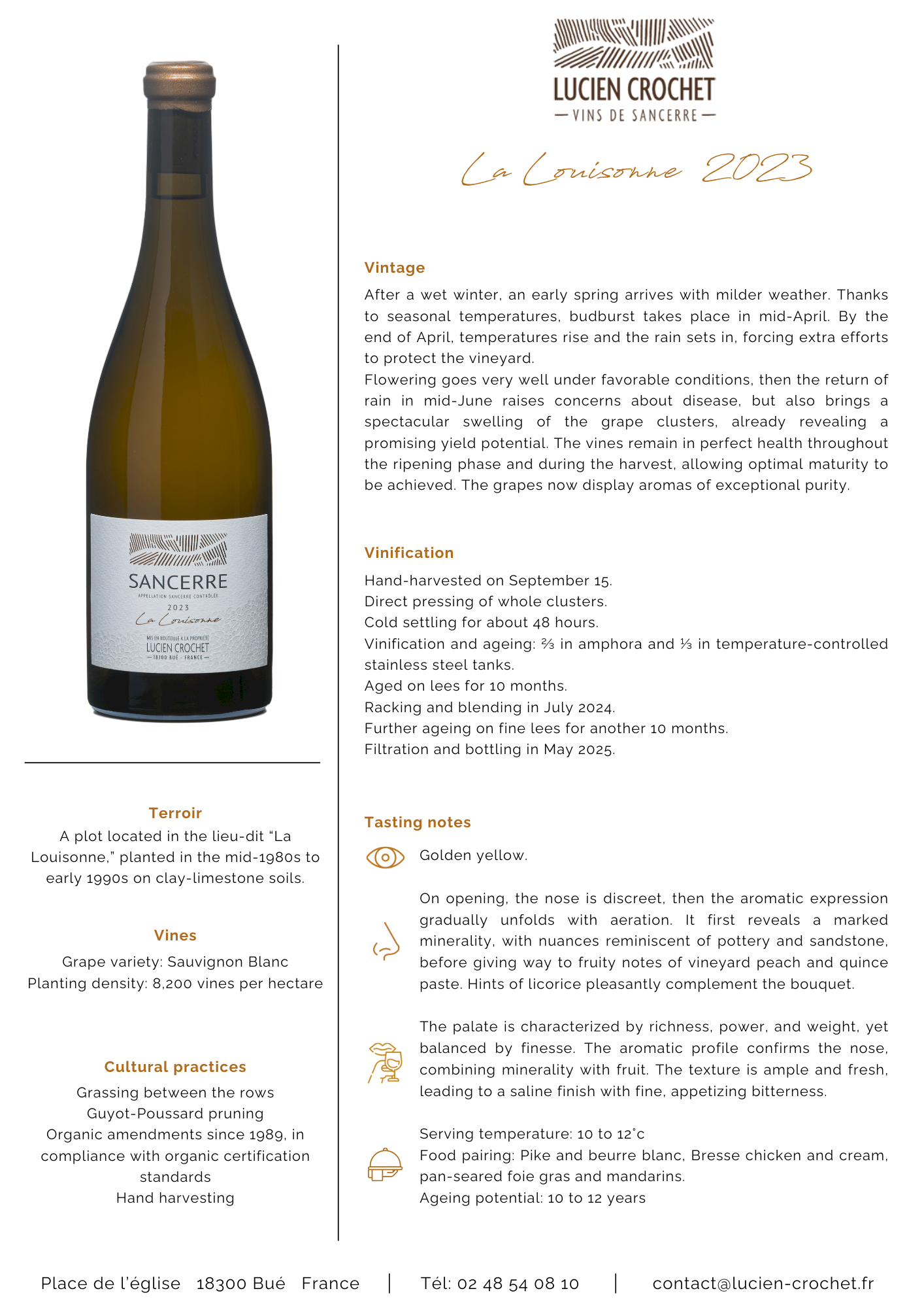 Nose: On opening, the nose is discreet, then the aromatic expression gradually unfolds with aeration. It first reveals a marked minerality, with nuances reminiscent of pottery and sandstone, before giving way to fruity notes of vineyard peach and quince paste. Hints of licorice pleasantly complement the bouquet.