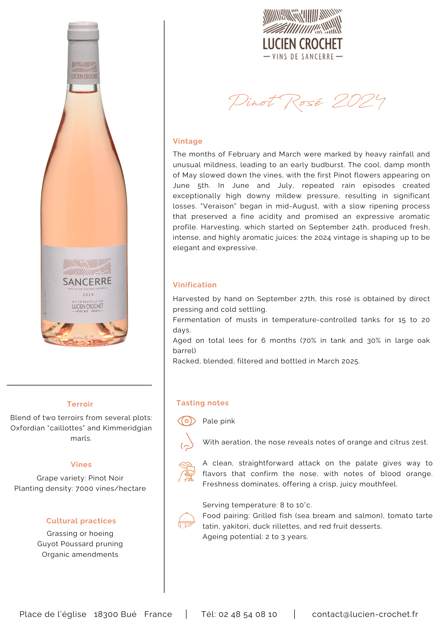 Harvested by hand on September 27th, this rosé is obtaines by direct pressing and cold settling.