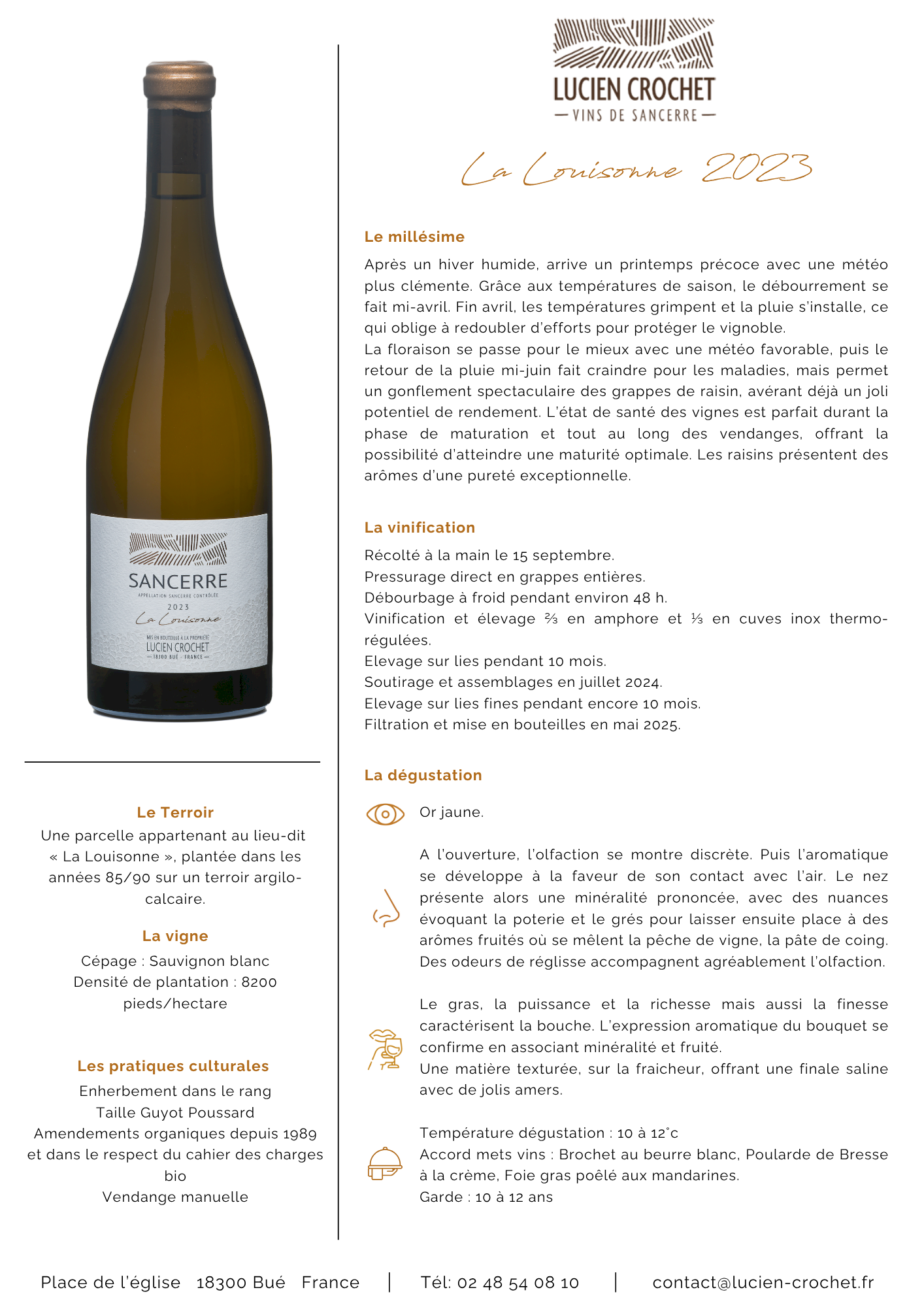 Bouche: Le gras, la puissance et la richesse mais aussi la finesse caractérisent la bouche. L’expression aromatique du bouquet se confirme en associant minéralité et fruité. Une matière texturée, sur la fraicheur, offrant une finale saline avec de jolis amers.